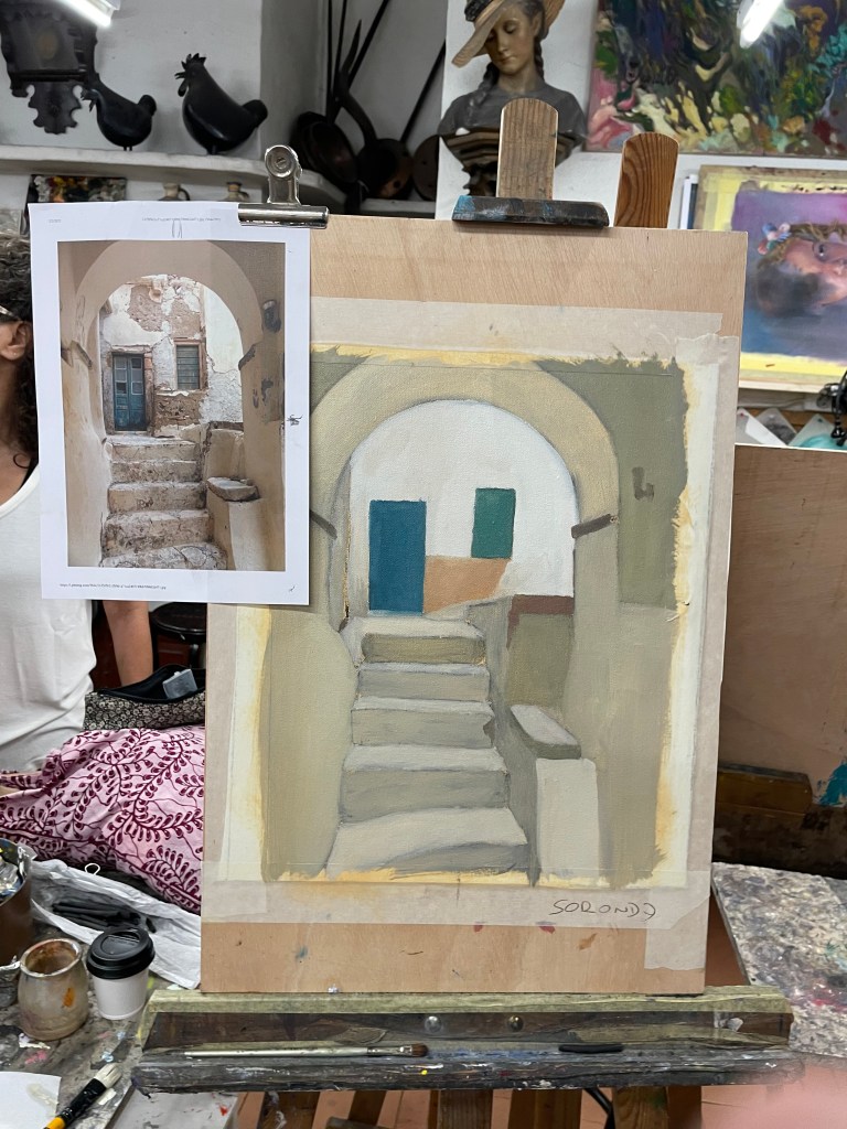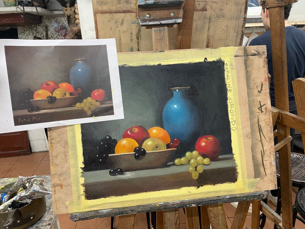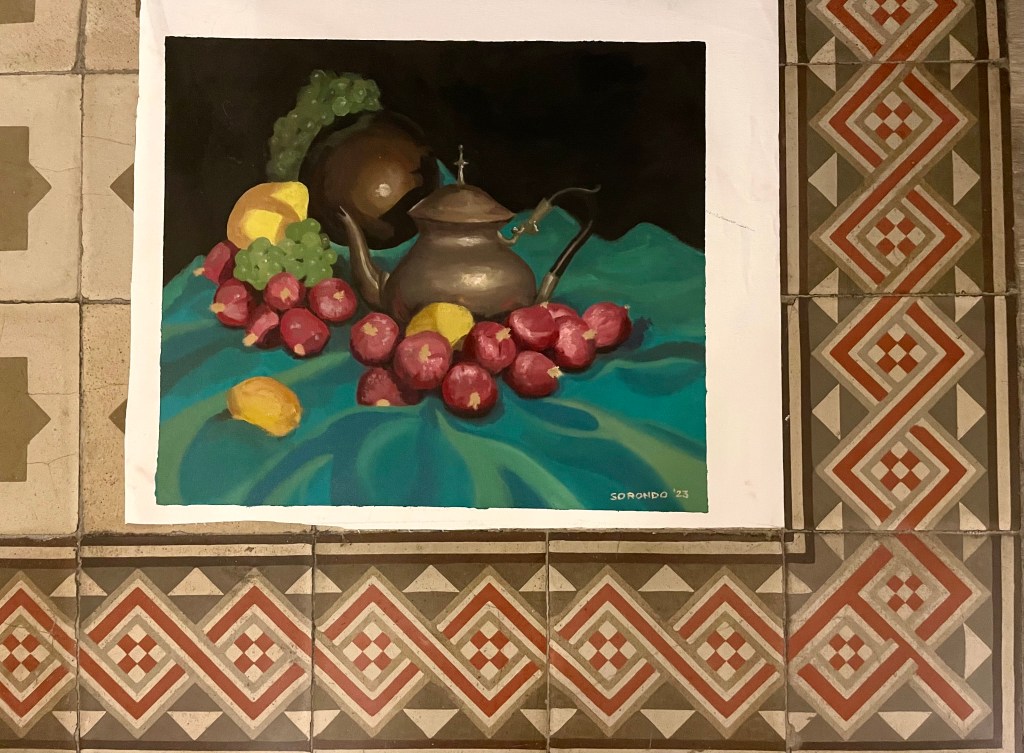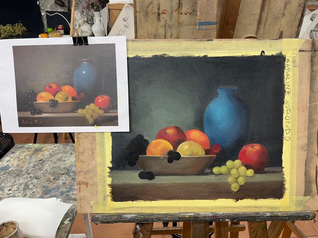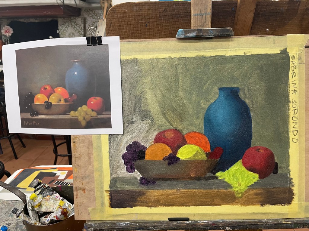 I grew up watching my grandmother, Estrella Díaz, painting oil masterpieces for a living. It was in Barcelona, Spain, that I took my first ever oil painting class at Academia Taure with my Argentinian profesor Ignacio Carmona. I took classes twice a week and they helped me learn and apply oil painting techniques, contrast, perspective, and color matching.