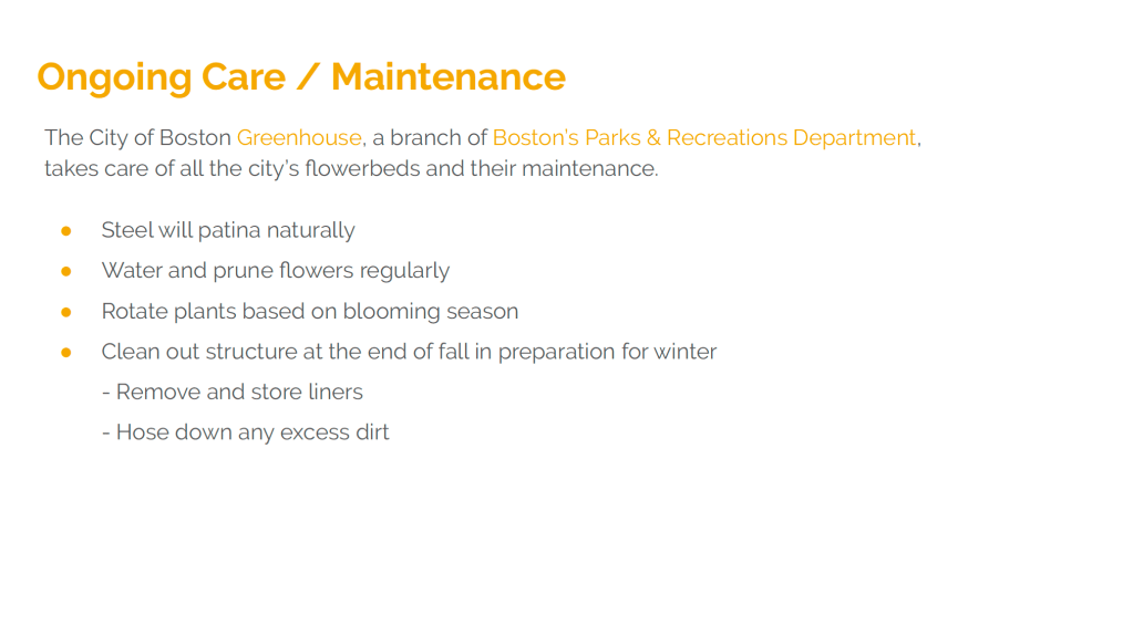 Our team included Bedelyn Dabel, Nathan Reilly, Melanie Forster, Adele Hennigar, and myself. The entire design process was consistently collaborative, but we played our strengths best and each of us put our talents to work. Adele focused on research most, Melanie and Bedelyn focused on the 3D prototype, Nathan focused on the CAD model, and I focused most on the concept development and presentation, like which flowers would work per season, finding where we could install the product, photoshopping the CAD model into real life scenes, and creating the slide deck.