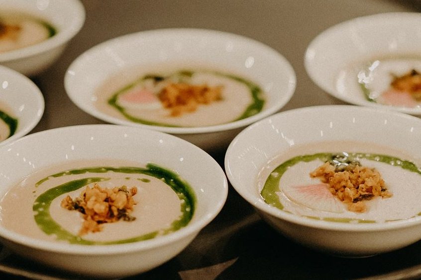 Tableware: Single-use items were avoided. The hors d’oeuvres plates which were compostable, made out of pressed plantain leaves.