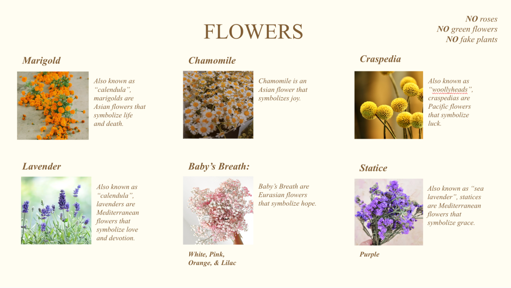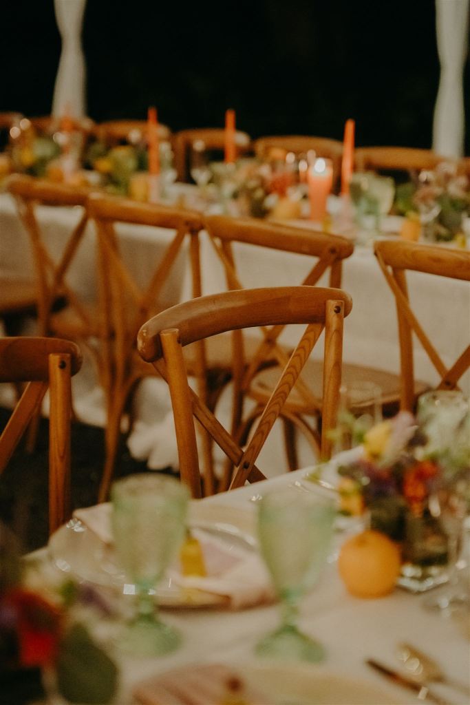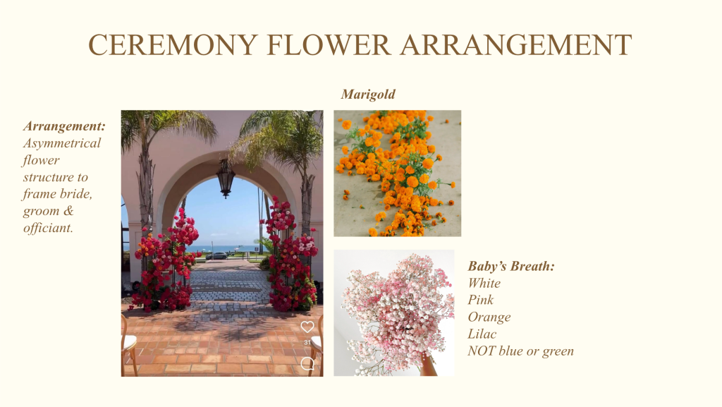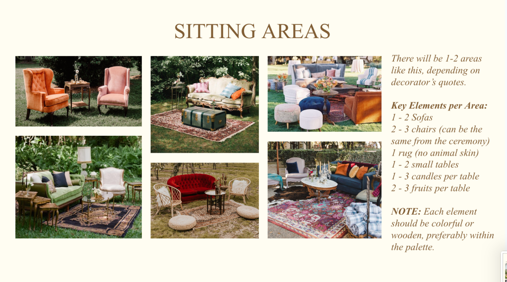 Decor: Our Decorator, Margaret’s Flowers, did a great job following my vision as closely as possible, switching out marigolds for orange peonies and such changes as necessary, creating the scene I laid out for her in a beautiful and organized way.