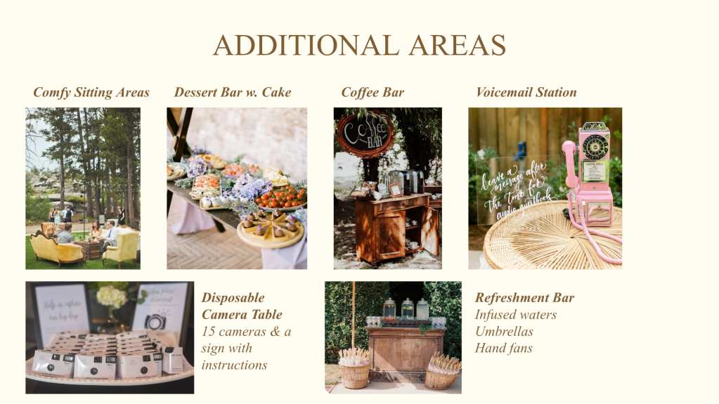 Accessibility: We chose our venue not only for its beauty, but for its lack of steps to climb to accommodate all of our guests as safely and comfortably as possible. Bathrooms caddies held items to freshen up.