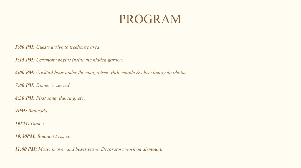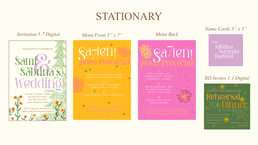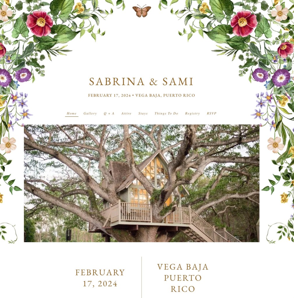 Website: To answer everyone’s questions efficiently and optimize traveling guests’ experience in Puerto Rico, I created a wedding website through The Knot. There, I laid out common Q+A’s, Things to Do, etc. This link was sent with their digital wedding invitation to input their RSVP, food allergies, and transportation.