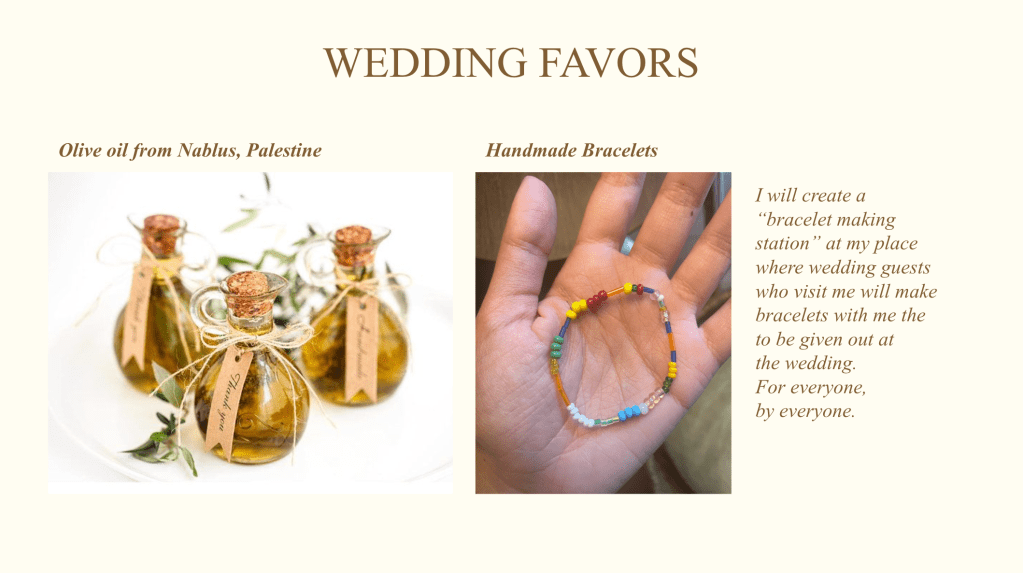 Wedding Favors: To give something treasurable to our guests that would not be discarded, we gifted them olive oil made in Nablus, Palestine (Free Palestine!) and handmade bracelets created by the guests themselves who visited us in the weeks leading up to the big day.