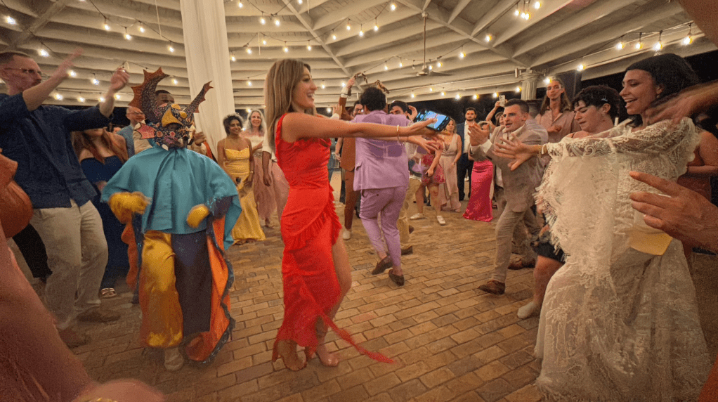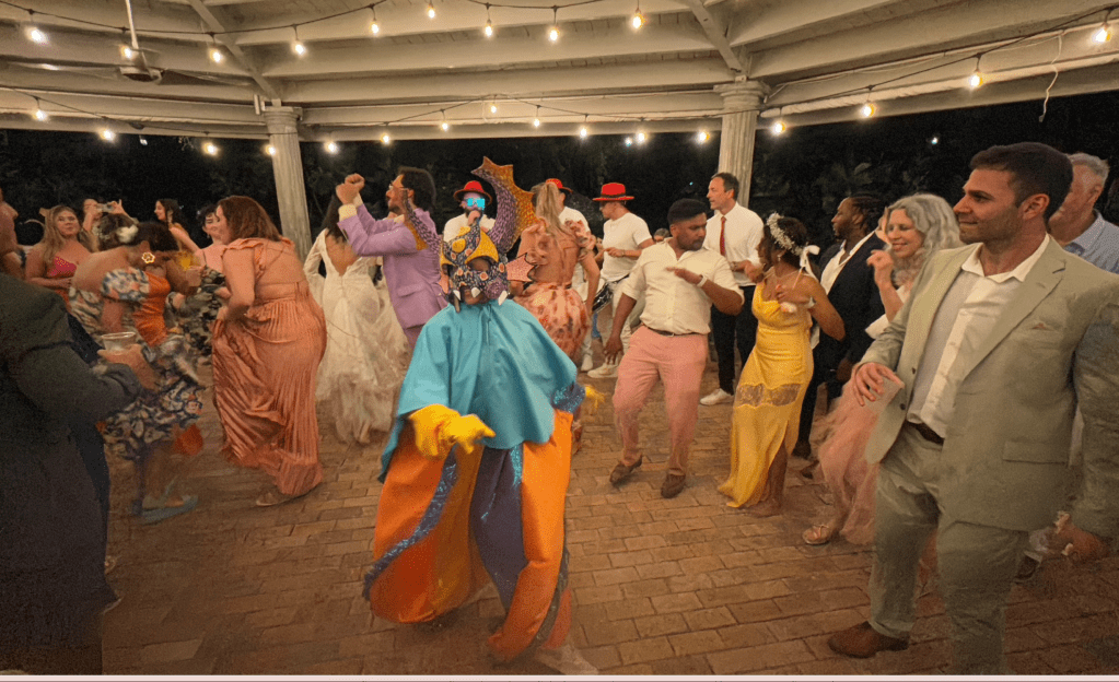 Music: The music we played included salsa, jazz, Arabic classics, bossa nova, reggaetón, American classics, boleros, and a live plena group at the end (playlist courtesy of the musical groom). A Vejigante performed with them; an ode to Puerto Rican culture (3rd picture to last).