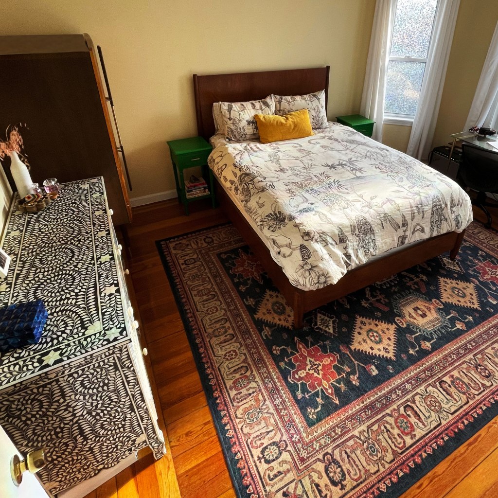 Something I missed that I do regret was not painting at least the main wall behind the bed a different, darker color. The monotone yellow that spread throughout the house and the lack of wall art or lamps left the room feeling a bit unfinished. If I was there now I’d paint it the two main walls the same rusty red the rug shows, would add small sconce lamps by the night stands, and maybe small triptych art with wide frames above the bed.