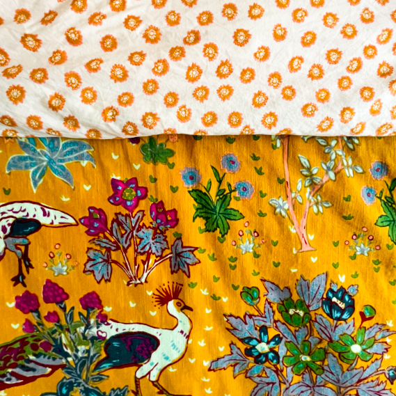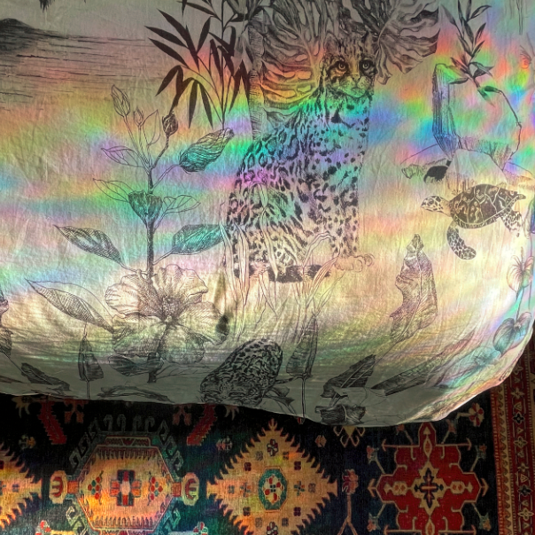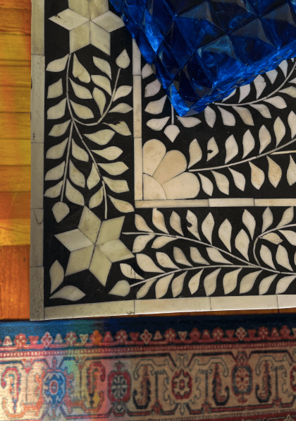 My favorite piece is the stunning inlay camel bone dresser from India, which not only adds storage but also serves as a beautiful new heirloom that we’ll treasure for generations to come. To add warmth and coziness to the room, I chose a gorgeous sapphire blue Persian rug design with rusty red accents to compliment the cherry wood floors. And to showcase our love of nature and art, I selected the Mathew Williamson jungle-themed bedding set, which has a modern take on pen and ink illustrations that adds personality to the space.