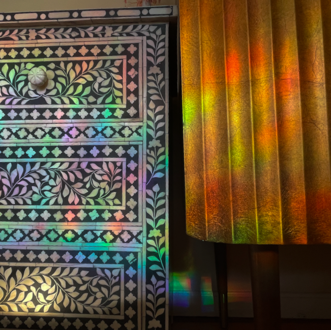 For a layer of privacy and to create the multi-color effect you see pictured, I applied a removable prism vinyl to every window in the house. These rainbow tones move across the room as the day progresses and it sets a magical tone that sparks serotonin in anyone with the eye to notice it. For the master bedroom with no built-in closet, I focused on maximizing the storage capacity of the room in a nifty way while prioritizing open and walkable space.