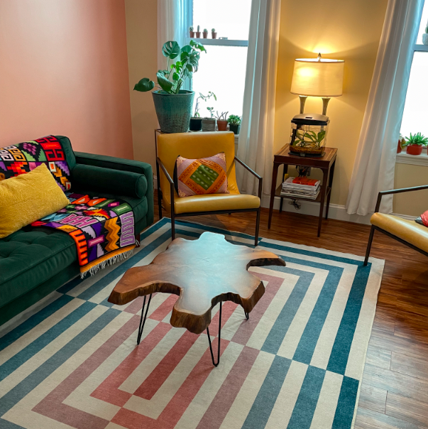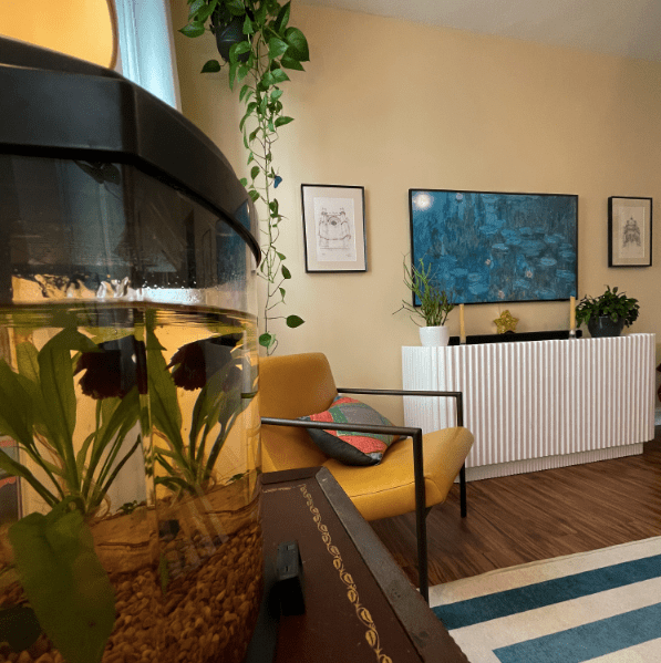 By including natural elements like the varied plants, the live edge coffee table, and even our beta fish (named El Alfa) and his tank (and the soft waterfall sound of his filter), the design of this living room catered to relaxation and ease. The room offered various settings to sit on like velvet, leather, wood, or even plush meditation poufs if necessary. These were arranged to encourage comfortable face-to-face conversations between occupants, creating a calm and soothing atmosphere that was perfect for unwinding and socializing.