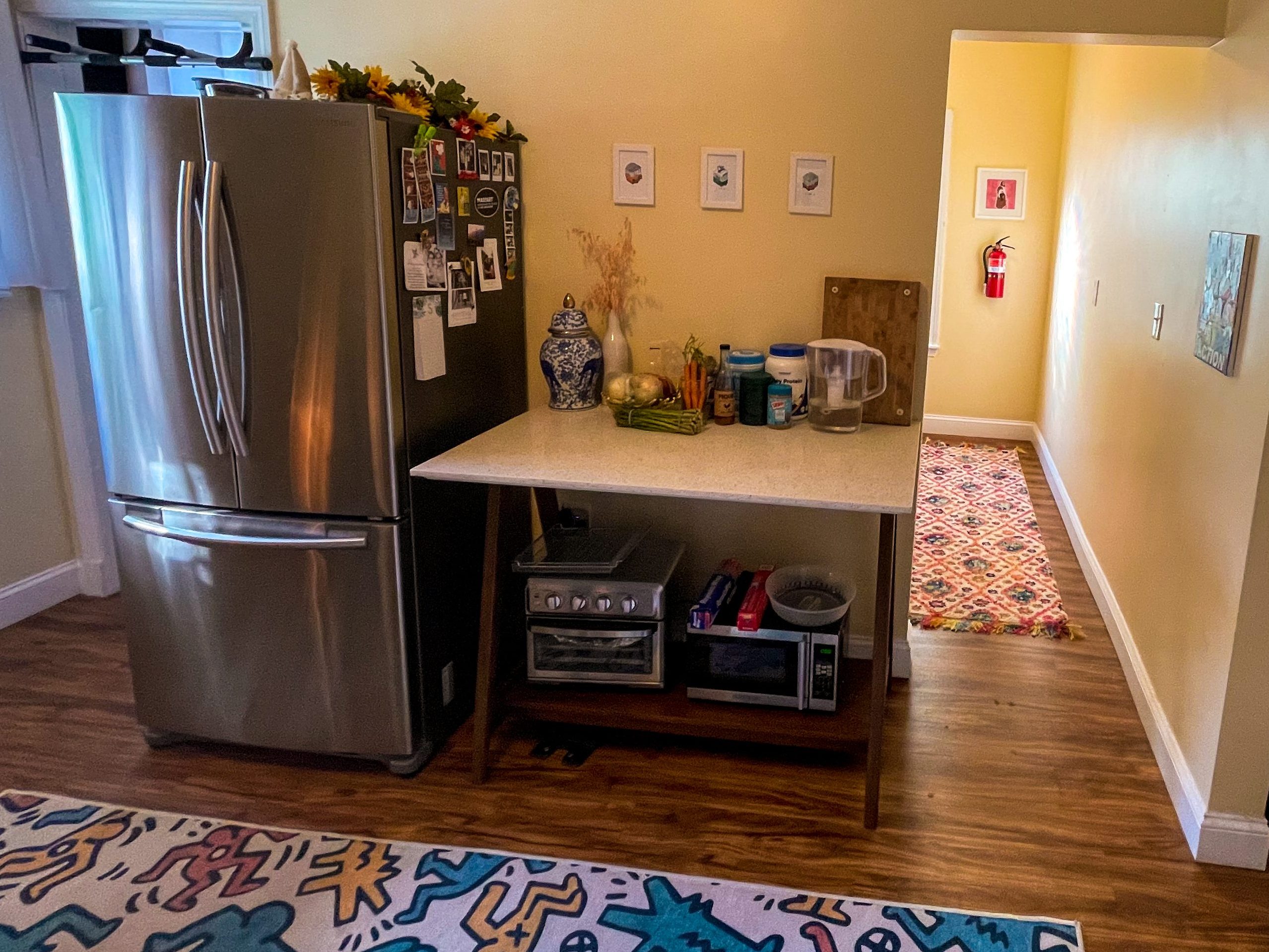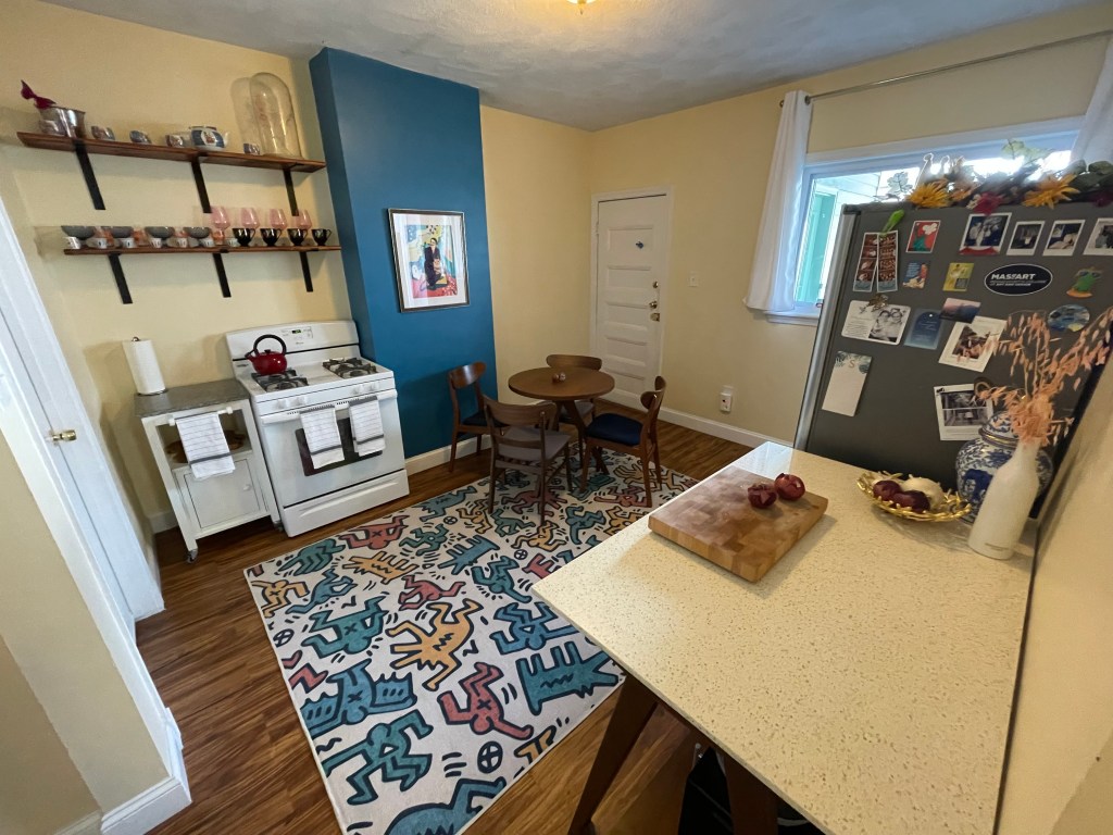 Through lots of browsing, I found second-hand furniture that fit where we needed it. I also built the shelves above the stove, staining pine planks to match the walnut wood of the dining table and the quartz island’s legs. One cohesive wood tone always ties a room together. The end product was beautifully adorned by a Keith Haring design rug that added a sense of playfulness and life to the kitchen. The fact that it was a washable rug made it all the more efficient when it came to cleaning. Against all odds, I made this kitchen work.